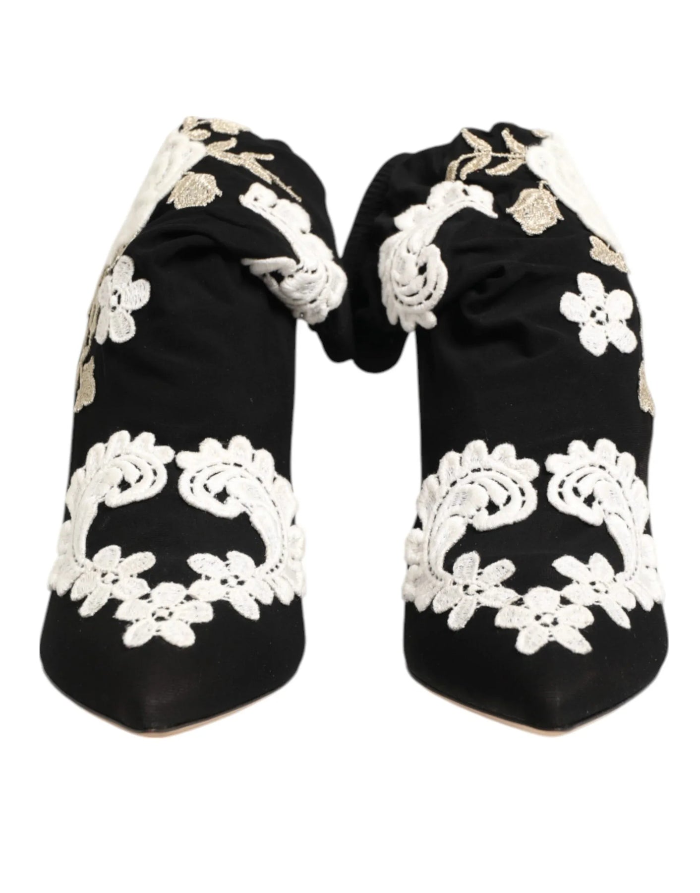 Gorgeous brand new with tags, 100% Authentic Dolce & Gabbana Women’s Stiletto Boots crafted from black stretch jersey with contrasting white and metallic floral embroidery. These elegant pointed-toe ankle boots feature a slim stiletto heel, combining modern style with timeless Dolce & Gabbana luxury.