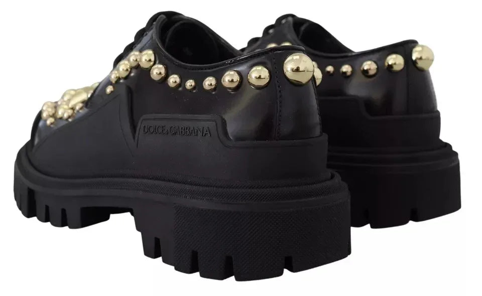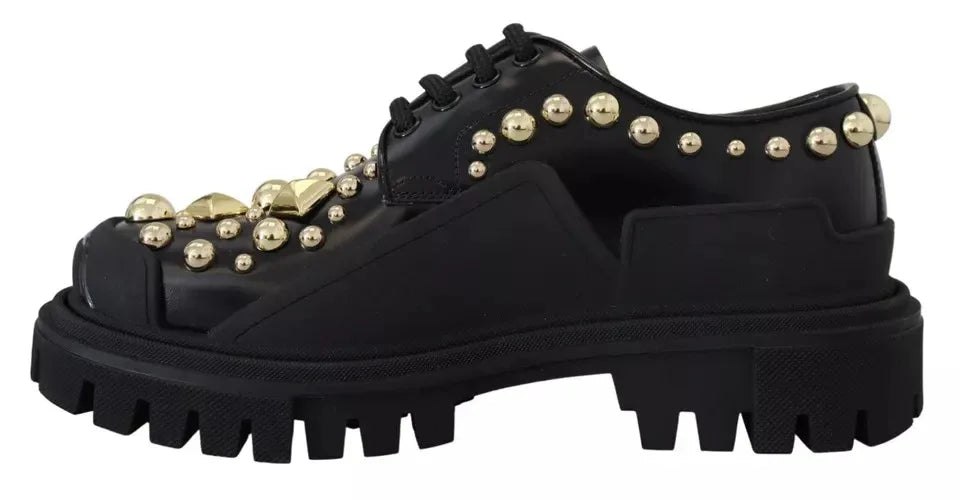 Gorgeous, brand new with tags 100% Authentic Dolce & Gabbana black Trekking derby. The model is made of soft polished leather, and the lapel-style inserts on the side panels are made of dense rubber. The masculine character of the pair on a chunky tread sole is balanced by the decorations, a pattern of shiny gold studs on the cape.